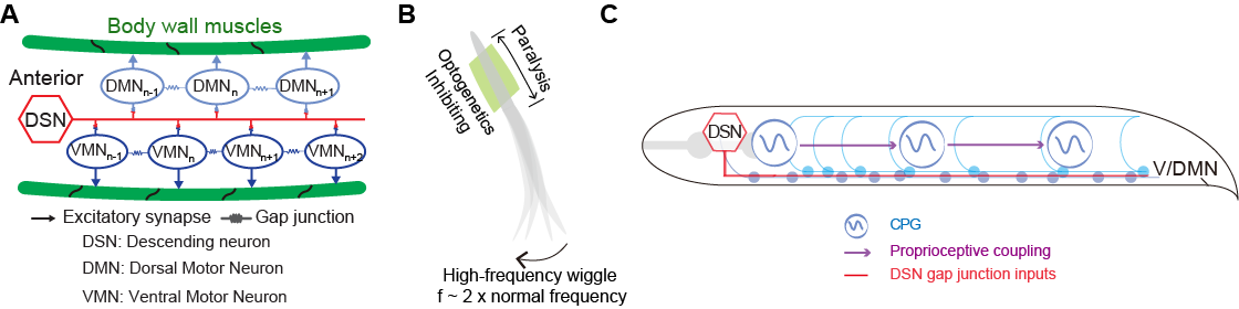 图一(A) 线虫前进运动环路电突触连接示意图。下行通路神经元与控制背侧和腹侧肌肉的所有前进运动神经元之间都有电突触连接。(B) 线虫身体后部产生高频摆动示意图。当用光遗传瞬时抑制的方法,切断线虫身体前部的下行信号和本体感受反馈时,位于线虫身体中部的CPG开始展现出来其内禀高频率并驱动尾部摆动。(C) 线虫协调前进运动的神经环路模型。下行通路神经元通过电突触连接与运动神经元感受的本体感受信号,共同协调分布式中枢模式发生器产生连贯的前进运动。